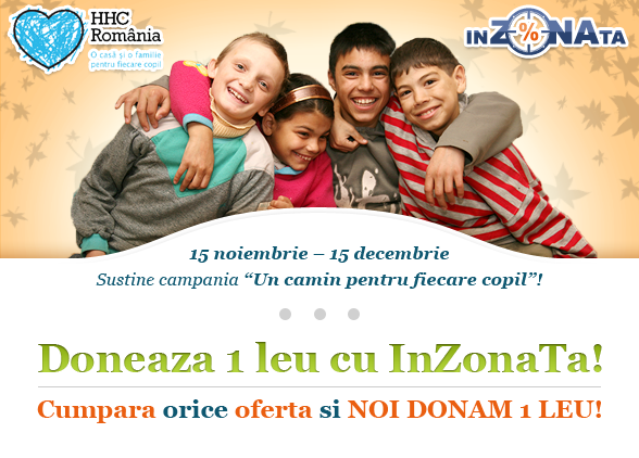 Împreună avem puterea să schimbăm ceva! Pentru orice ofertă cumparată până pe 15 decembrie 2012 www.InZonaTa.ro donează 1 leu! Mai multe detalii pe http://www.inzonata.ro/social