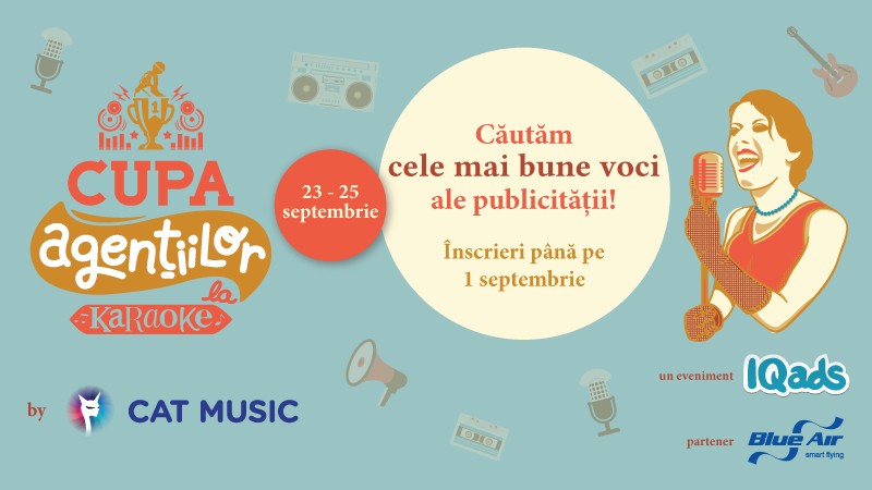 Până la 1 septembrie asteptăm înscrieri în competiția dedicată publicitarilor cu ureche muzicală și o pasiune pentru a se auzi cântând. Ne gândim la cei care văd în orice obiect un microfon de scenă și care vor să înlocuiască covorașul de baie cu covorul roșu. Cat Music este naming partner al evenimentului, aducând mai multe vedete din portofoliu care vor cânta împreună cu publicitarii participanți. De asemenea, MC-ul Cupei Agentiilor la Karaoke by Cat Music va fi CRBL. Evenimentul este susținut de Blue Air, care propune o probă specială și premii pentru participanți.